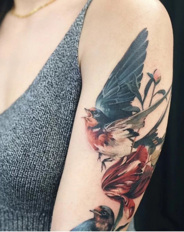肩部上干净生动时尚好看的花鸟纹身图图片