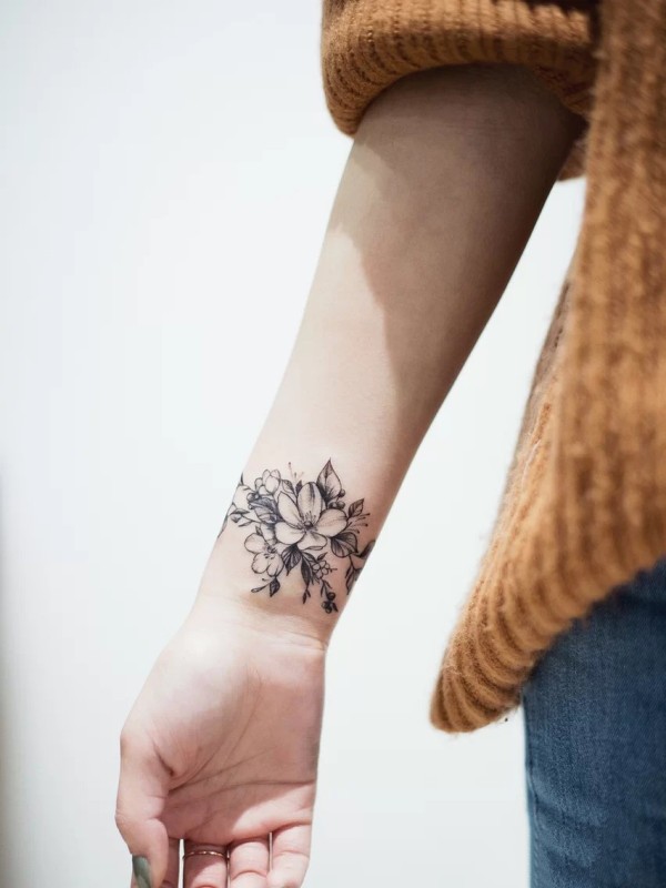 缠绕在小手臂手腕上的花藤纹身图案作品