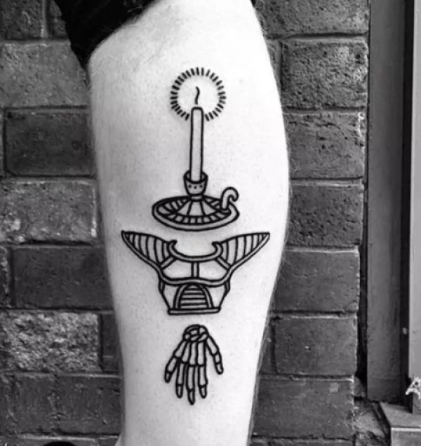 大腿上黑白灰风格点刺身抽象线条人物肖像纹身图片