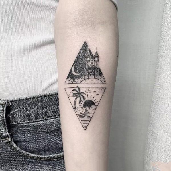 男生手臂上黑色点刺几何三角形山水风景纹身图片
