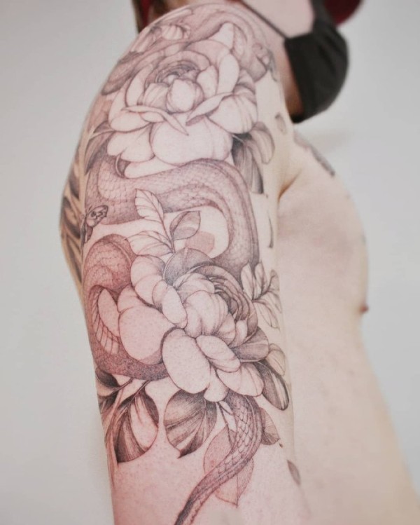 大臂素花纹身 9款女士的大臂黑灰花朵植物纹身图案