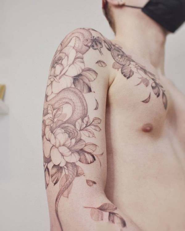 大臂素花纹身 9款女士的大臂黑灰花朵植物纹身图案