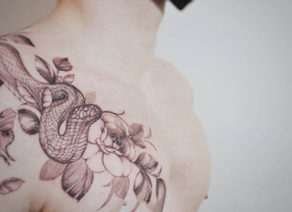 大臂素花纹身 9款女士的大臂黑灰花朵植物纹身图案