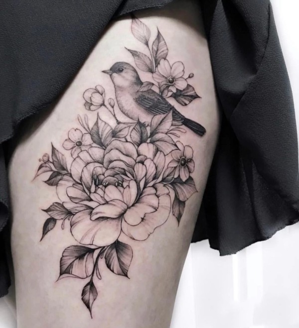 性感大腿纹身 女士大腿处性感的花花纹身图片