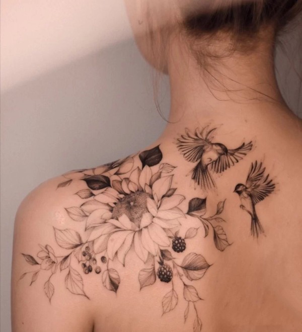 女生肩部的黑灰素花纹身作品图