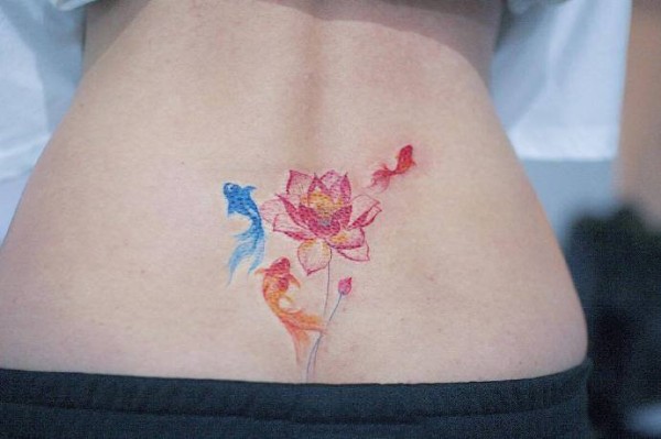 非常霸气的半甲经典彩色鲤鱼花卉纹身图案