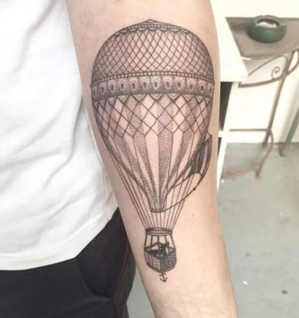 手臂纹身图片 男生手臂上人物和热气球纹身图片