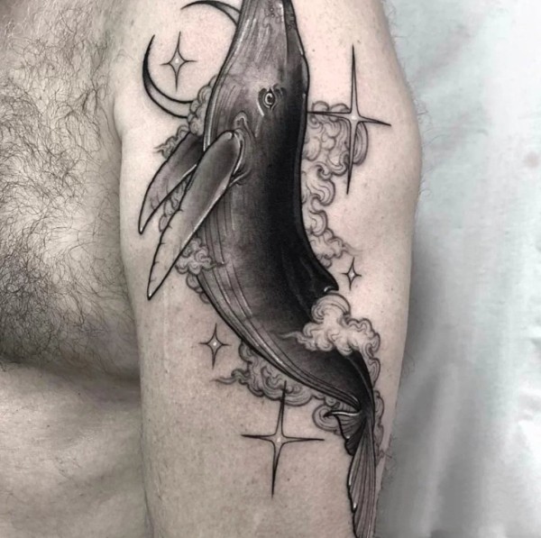 蝙蝠,幼狮,鲤鱼组成的花臂纹身