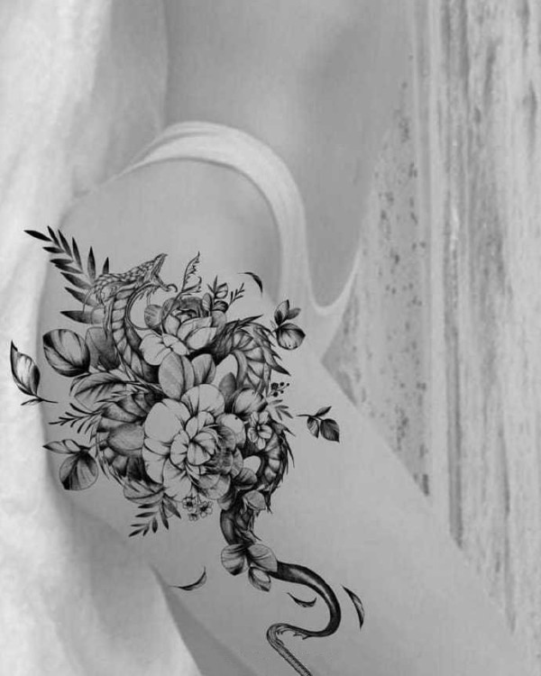 性感大腿纹身 女士大腿处性感的花花纹身图片