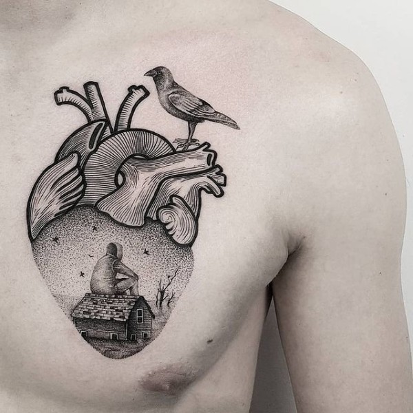 心脏纹身图案 女生手臂上黑灰纹身心脏纹身图案