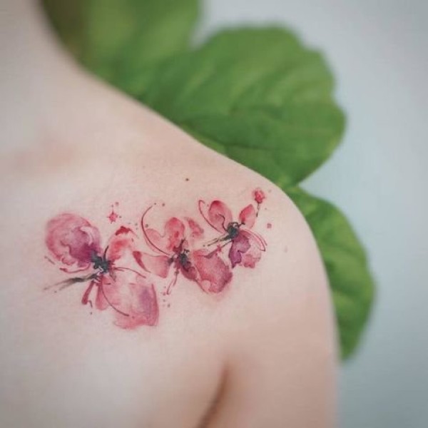 女生肩部锁骨的小清新水彩花朵纹身图案