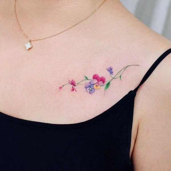 女生肩部锁骨的小清新水彩花朵纹身图案