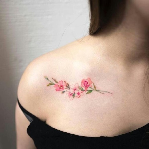 女生肩部锁骨的小清新水彩花朵纹身图案