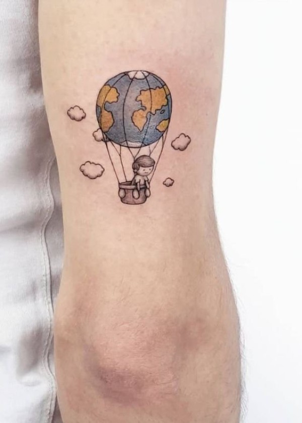 手臂纹身图片 男生手臂上人物和热气球纹身图片