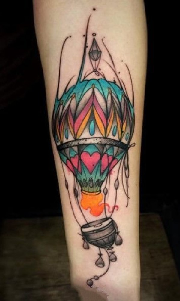 热气球纹身 男生手臂上花朵和热气球纹身图片