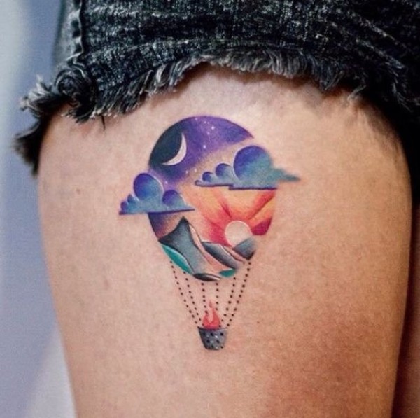 热气球纹身图案身 女生大腿上彩色的热气球纹身图片