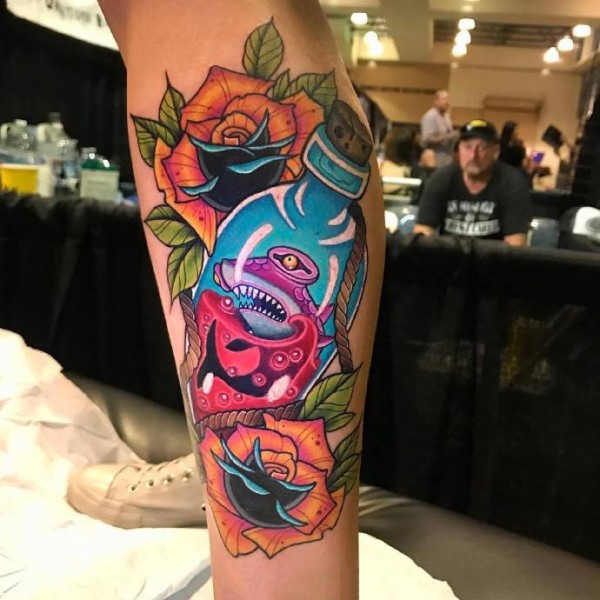 大腿上的国外欧美彩色new school 花腿纹身
