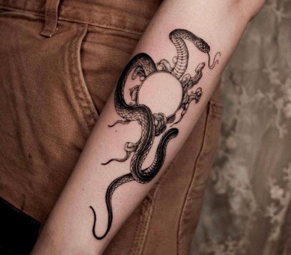 黑色和白色手臂眼镜蛇纹身动物几何点刺纹身图案