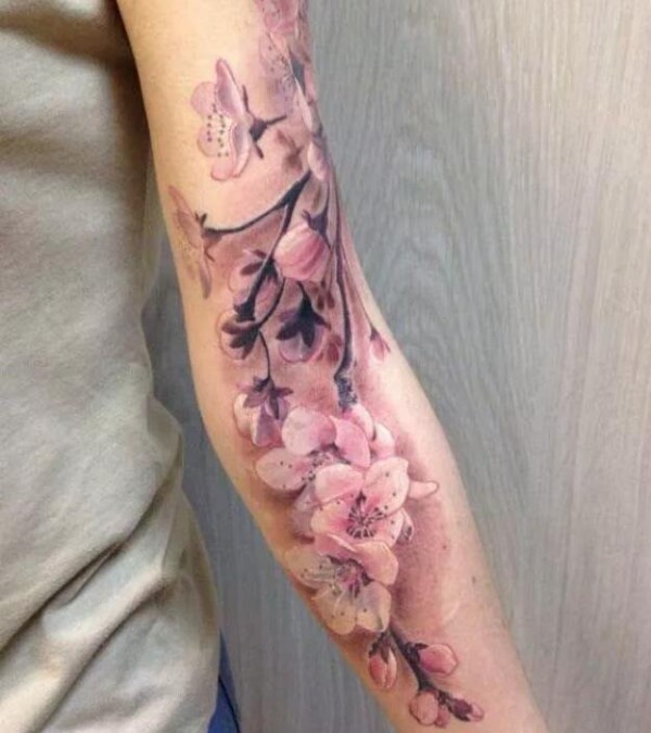 纹在手臂胳膊上的黑灰素花花卉纹身图案欣赏