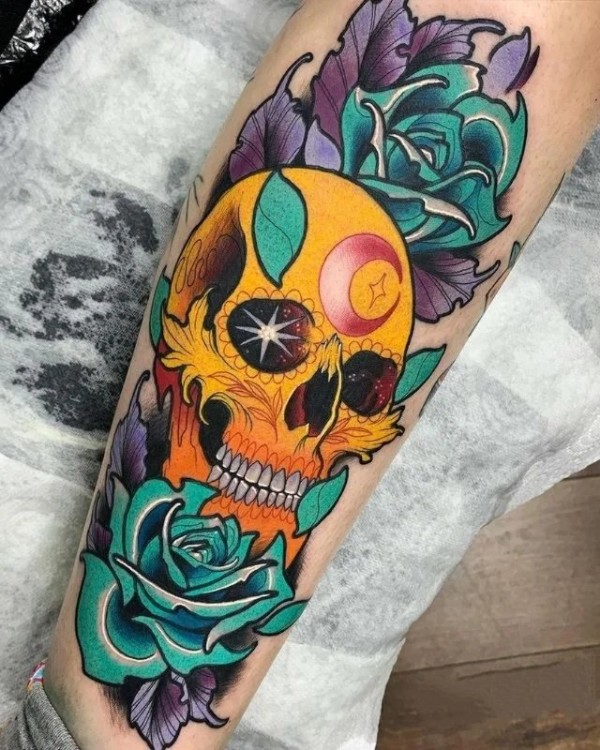 女生手臂经典潮流的骷髅与玫瑰花纹身图案