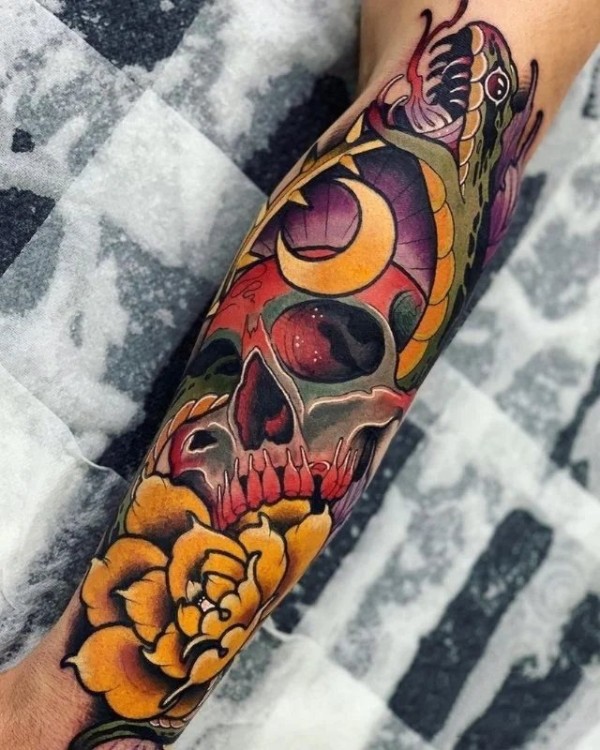 超帅时尚的黑灰骷髅与蛇纹身图案