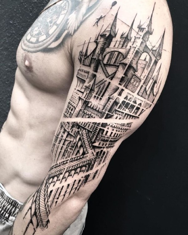 欧美大黑灰风格的城堡建筑系纹身作品