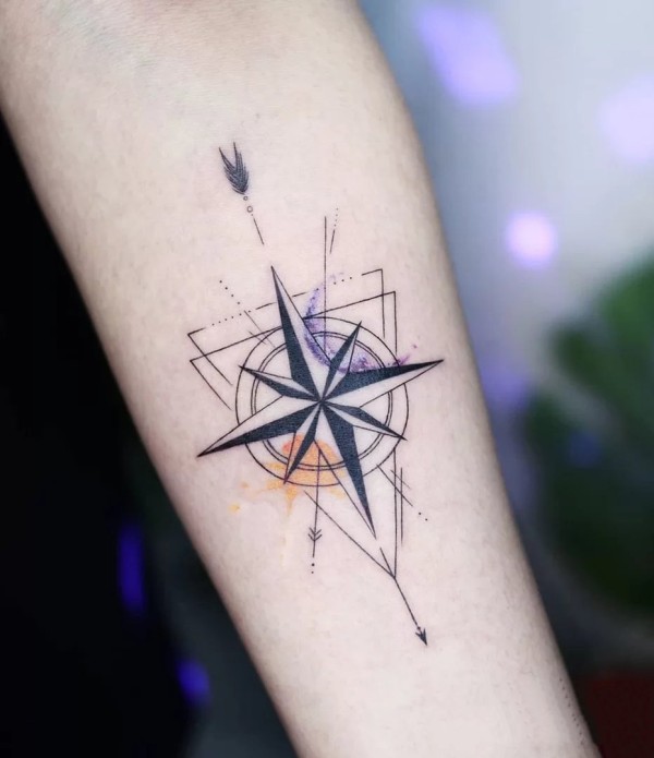 几何元素纹身 男生手臂上指南针和箭矢纹身图片