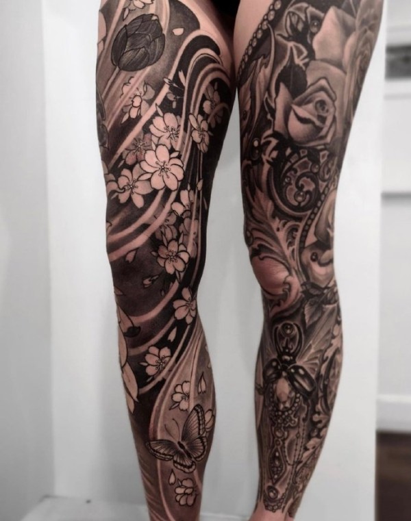 新传统花朵纹身:黑灰新传统风格的素花花卉纹身图案