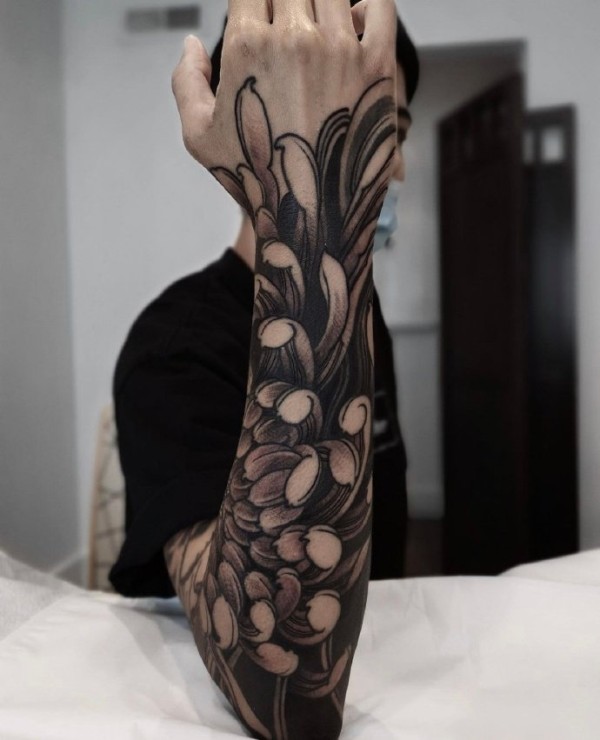 新传统花朵纹身:黑灰新传统风格的素花花卉纹身图案