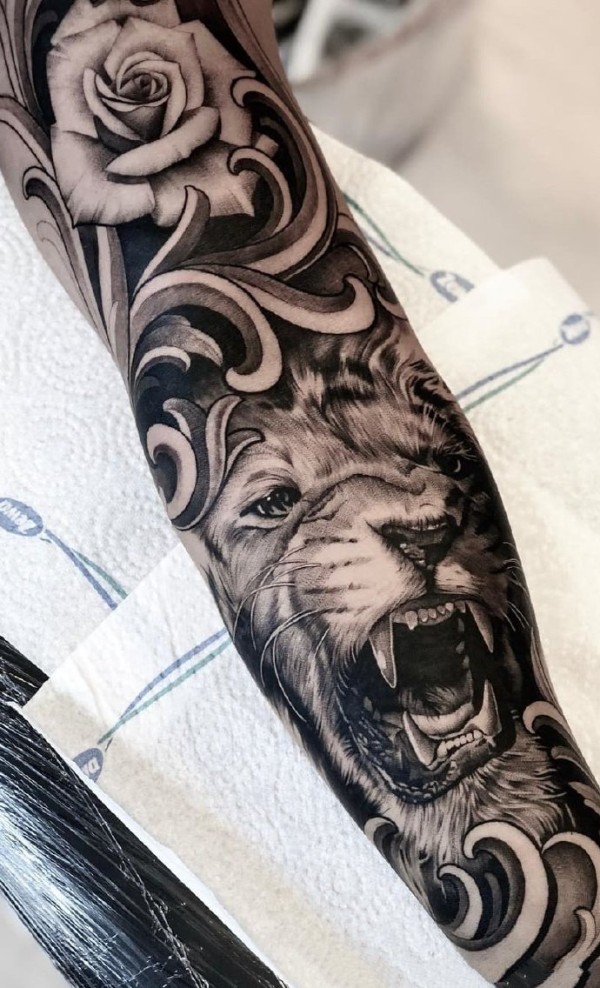 狮头虎头纹身 9组逼真的手臂包臂写实虎头和狮子头纹身图案