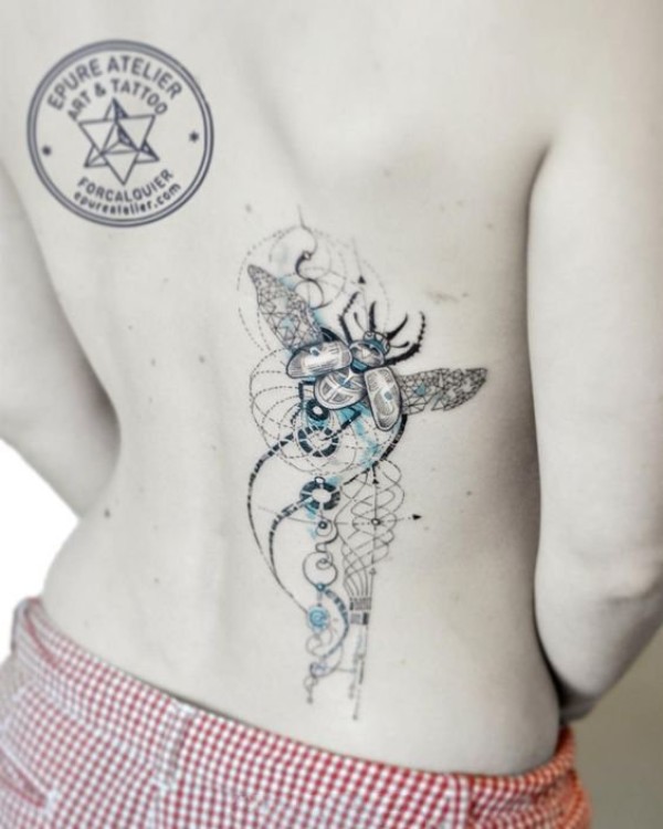 女生后腰纹身黑白灰风格抽象线条纹身图案