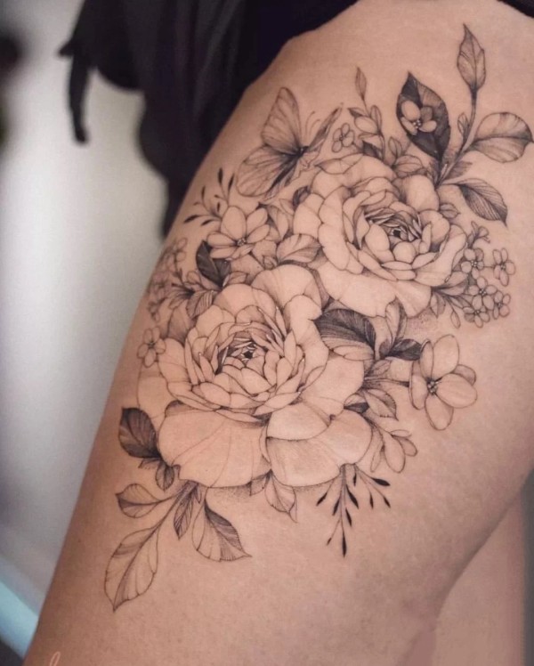 大臂素花纹身 9款女士的大臂黑灰花朵植物纹身图案