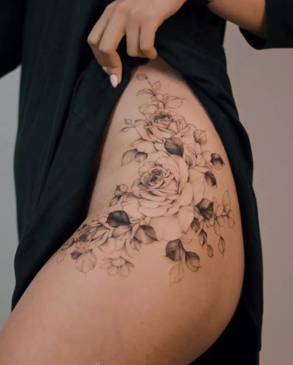 性感大腿纹身 女士大腿处性感的花花纹身图片
