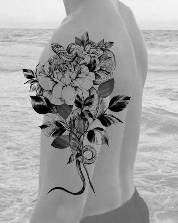 大臂素花纹身 9款女士的大臂黑灰花朵植物纹身图案