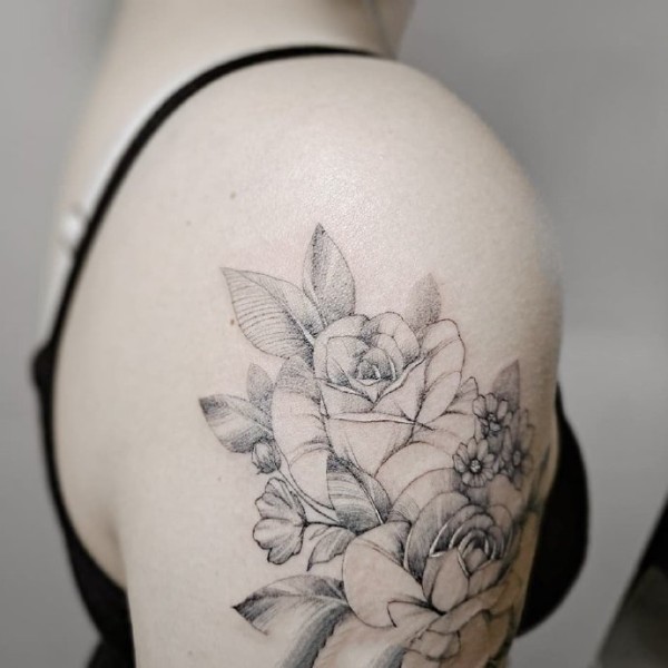 大臂素花纹身 9款女士的大臂黑灰花朵植物纹身图案