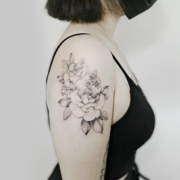 女生肩部的黑灰素花纹身作品图