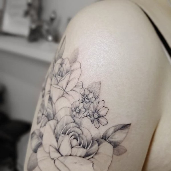 大臂素花纹身 9款女士的大臂黑灰花朵植物纹身图案
