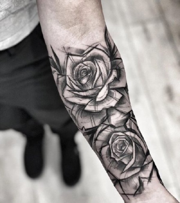 黑灰色玫瑰花和骷髅头纹身图片手稿
