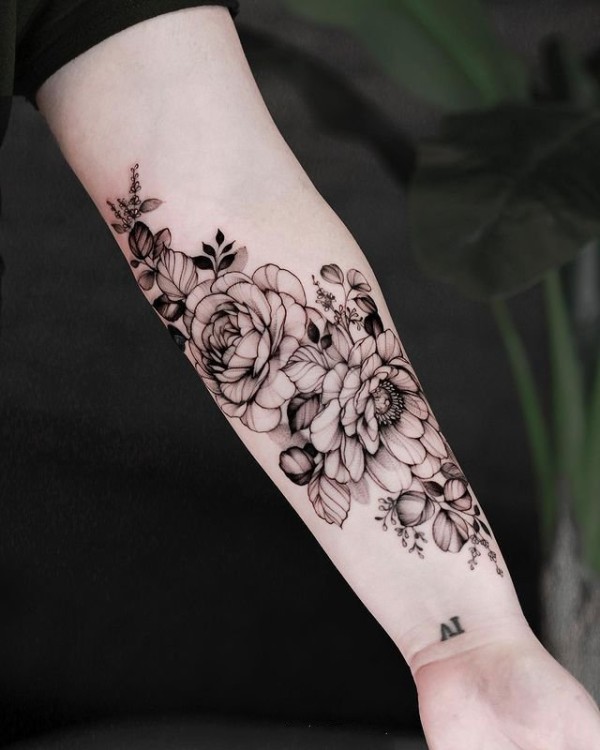 大臂素花纹身 9款女士的大臂黑灰花朵植物纹身图案