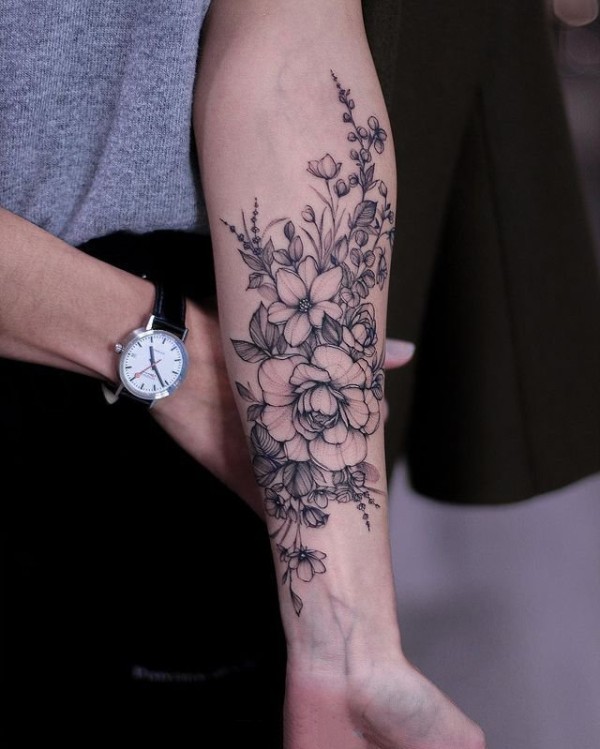 大臂素花纹身 9款女士的大臂黑灰花朵植物纹身图案