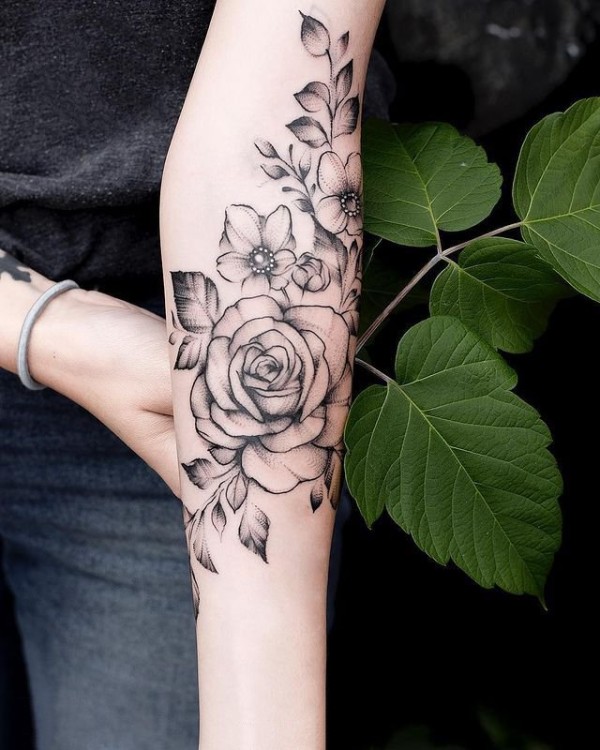 大臂素花纹身 9款女士的大臂黑灰花朵植物纹身图案