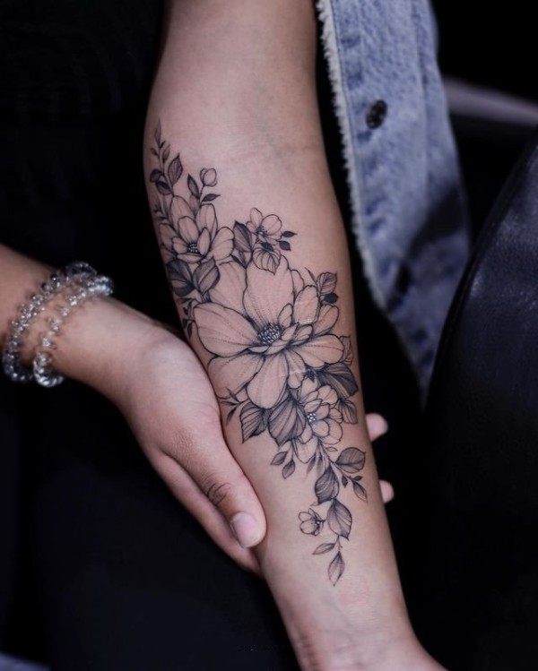 小臂上小清新的黑灰素花纹身图片