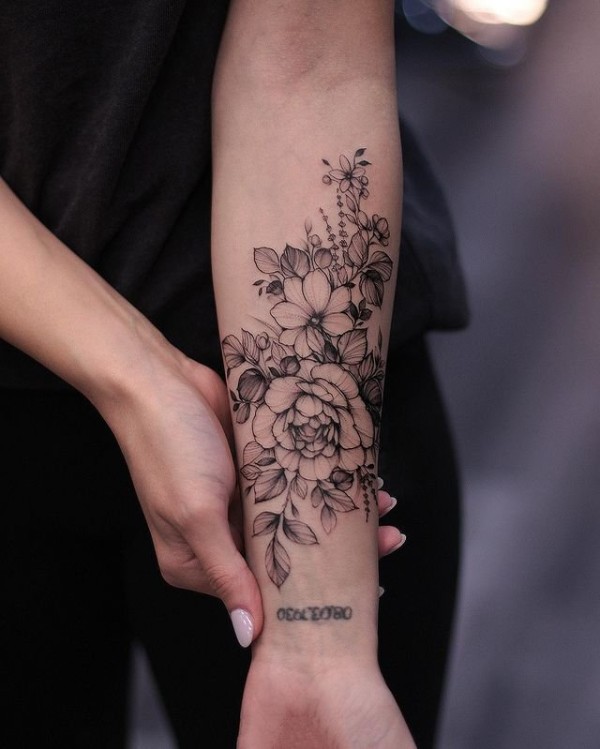 大臂素花纹身 9款女士的大臂黑灰花朵植物纹身图案
