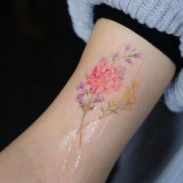 纹在手臂胳膊上的黑灰素花花卉纹身图案欣赏