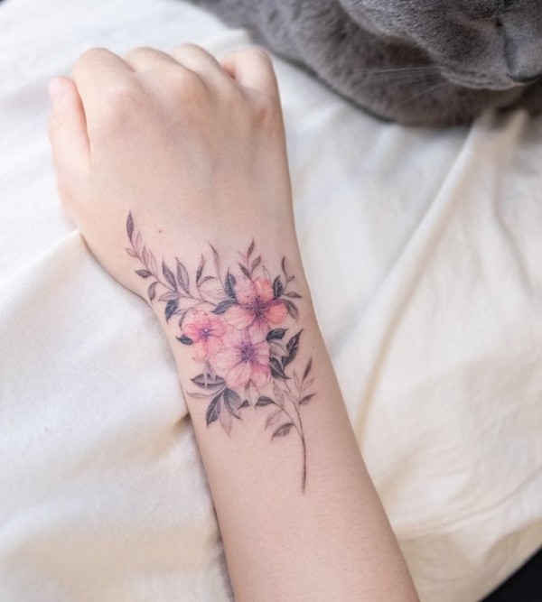 纹在手臂胳膊上的黑灰素花花卉纹身图案欣赏