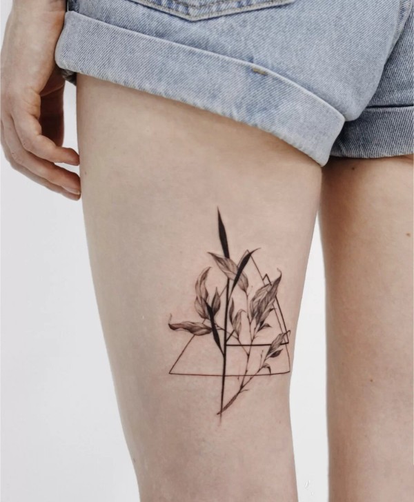 大腿上黑白灰风格点刺身抽象线条人物肖像纹身图片