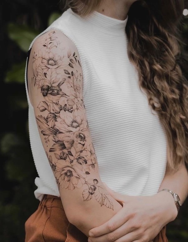 大臂素花纹身 9款女士的大臂黑灰花朵植物纹身图案