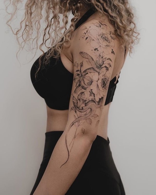 大臂素花纹身 9款女士的大臂黑灰花朵植物纹身图案