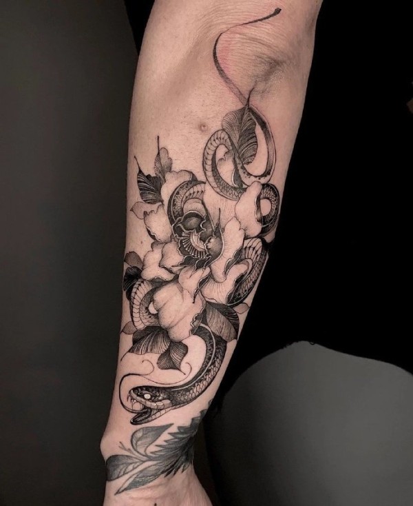 黑色和白色手臂眼镜蛇纹身动物几何点刺纹身图案