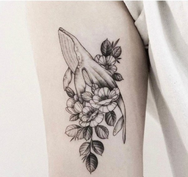 大臂素花纹身 9款女士的大臂黑灰花朵植物纹身图案